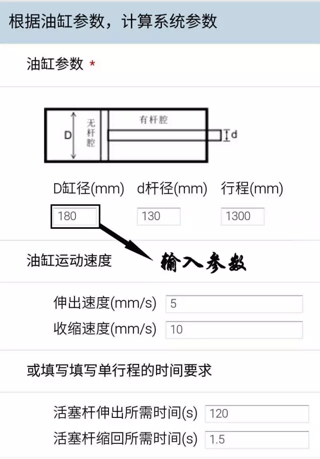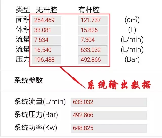 在液壓系統(tǒng)計(jì)算器里,輸入油缸的基本參數(shù),計(jì)算器自動(dòng)輸出液壓系統(tǒng)流量、壓力、功率。 “黑色的”為您需要輸入的數(shù)據(jù),“紅色的”為系統(tǒng)自動(dòng)計(jì)算的數(shù)據(jù)。