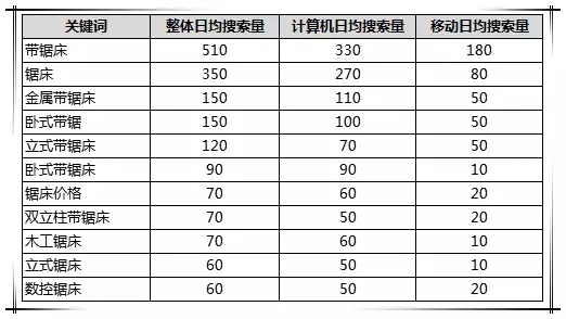 比如市民王先生想購(gòu)買一臺(tái)4028臥式帶鋸床,他先在百度上輸入“帶鋸床”這個(gè)詞出來(lái)一些公司,一 一 查閱后感覺(jué)不滿意,他再輸入“臥式帶鋸床”這個(gè)詞搜索,還是不滿意,最后他用“4028臥式帶鋸床”搜索。其中帶鋸床、臥式帶鋸床、4028臥式帶鋸床,都是市民王先生用過(guò)的關(guān)鍵詞。