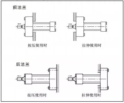 ?。?)法蘭安裝適合于液壓缸工作過程中固定式安裝,其作用力與支承中心處于同一軸線的工況;其安裝方式選擇位置有端部、中部或尾部三種,如何選擇取決作用于負(fù)載的主要作用力對活塞桿造成壓縮(推)應(yīng)力、還是拉伸(拉)應(yīng)力,一般壓縮(推)應(yīng)力采用尾部、中部法蘭安裝,拉伸(拉)應(yīng)力采用端部、中部法蘭安裝,確定采用端部、中部或尾部法蘭安裝需同時(shí)結(jié)合系統(tǒng)總體結(jié)構(gòu)設(shè)計(jì)要求和長行程壓縮(推)力工況的液壓缸彎曲穩(wěn)定性確定。